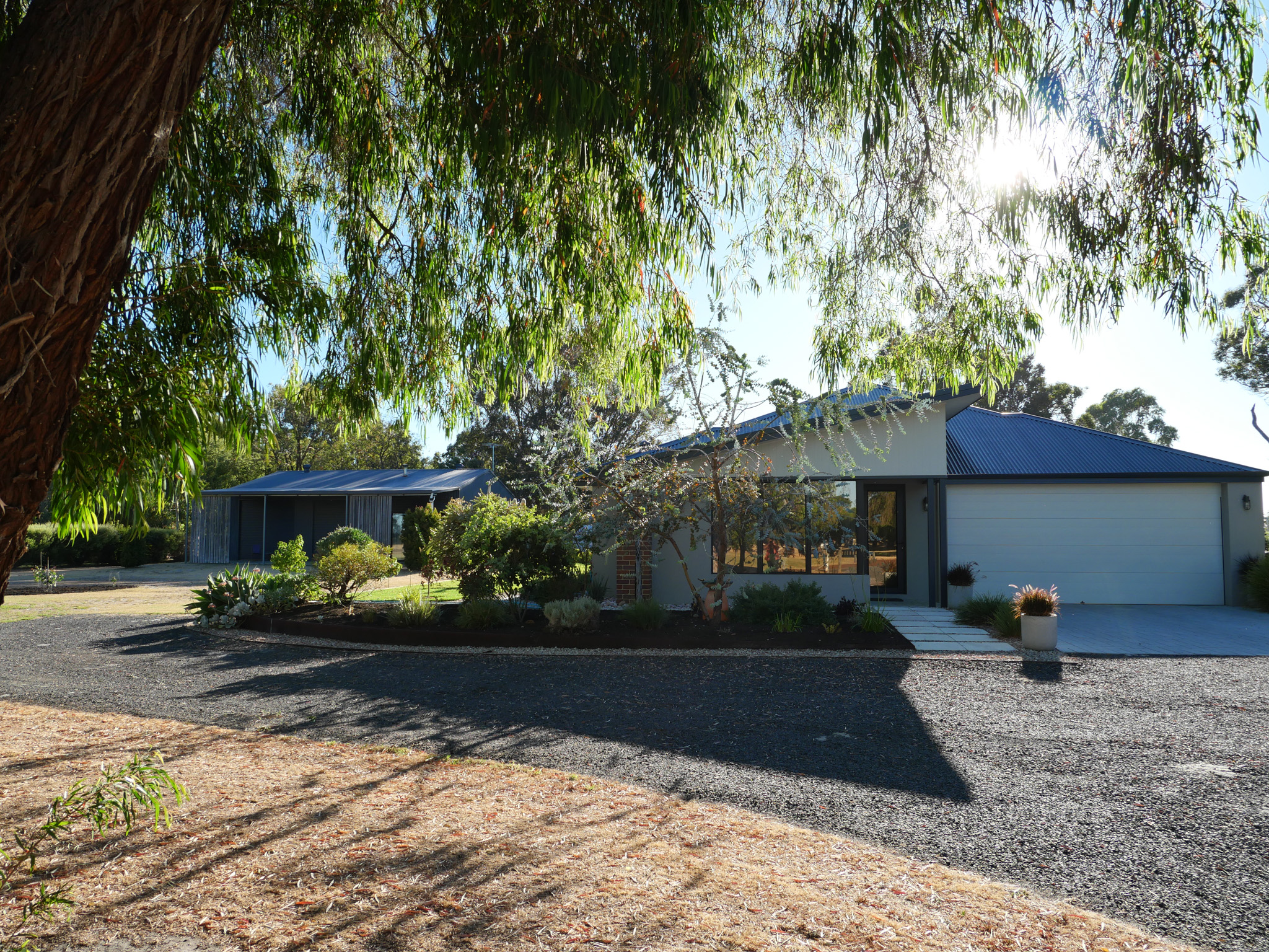 The home has a huge light and airy open plan living area with floor to ceiling windows to take in the views. It has been meticulously built in double brick with metal roof with an attractive skillion roof to the front of the home. The open plan living includes a modern sleek kitchen which overlooks the dining and a comfortable sitting area. The home has four bedrooms and two bathrooms and an extra activity/study/teenage retreat. A large three bay three phase shed which comprises of two bays of workshop with handmade stairs to a storage platform. The third bay has been converted into a studio with a living and kitchen area, woodstove, a bedroom upstairs with a combined bathroom, toilet and laundry.